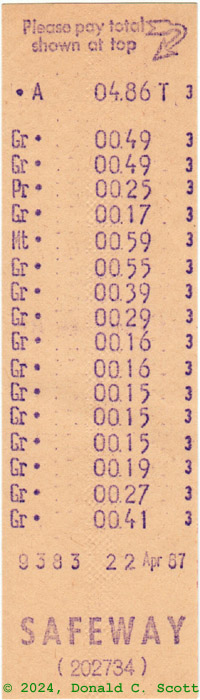 This is a post about a simple document from everyday life – a grocery store receipt dated 22 April 1967. This particular one was discovered a few years ago among some old family papers, and scanned at that time. It summarizes a shopping trip to a Safeway grocery store, most likely in Southern California, made a little more that 57 years ago. Why it came to be saved is unknown, but by the time I found it the prices were different enough from today’s to make it interesting.