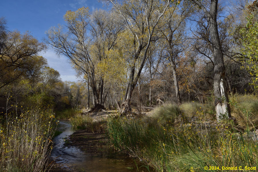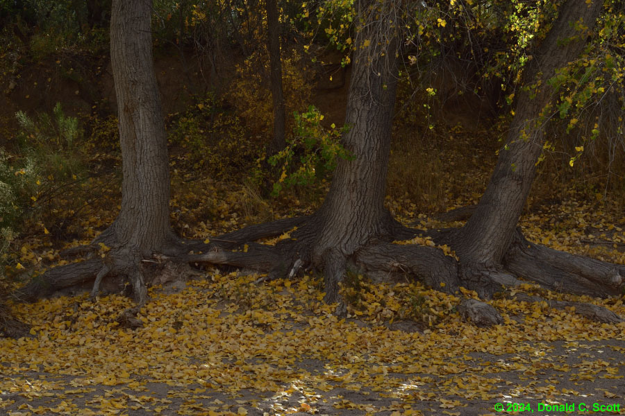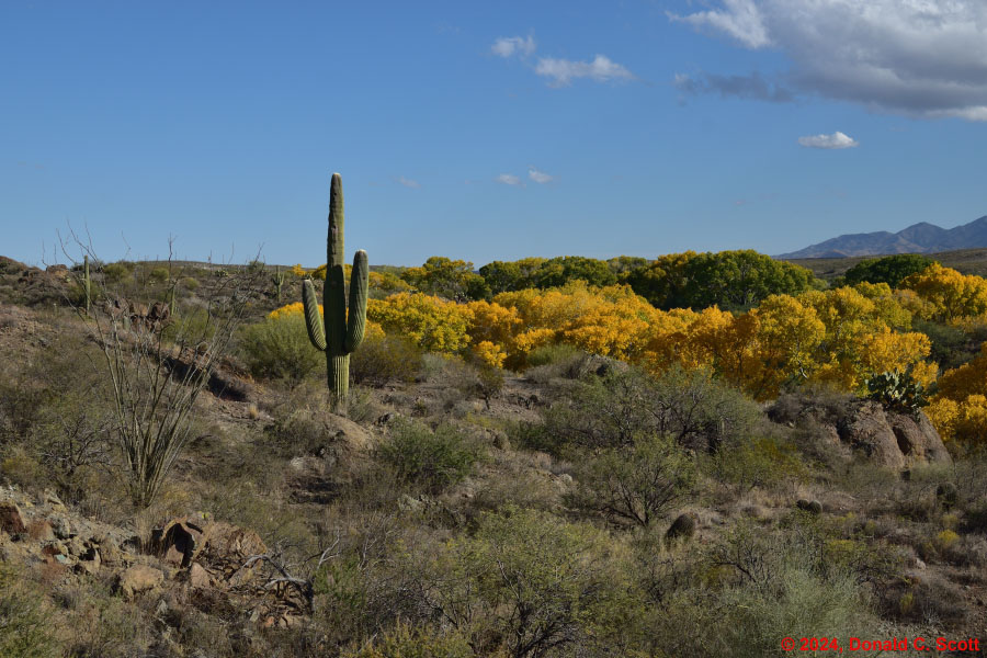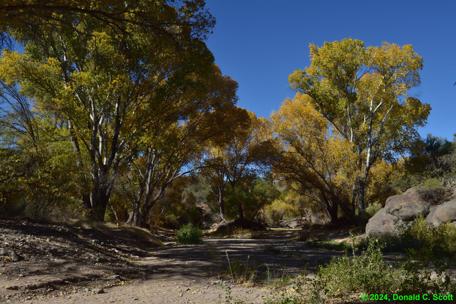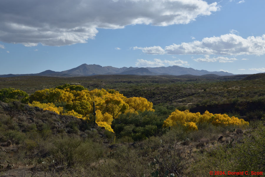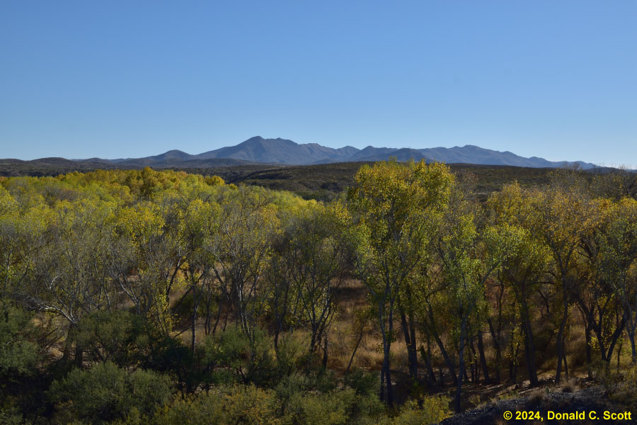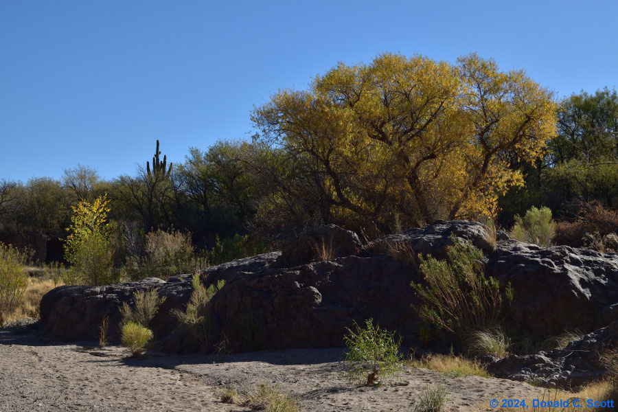 Cienega Creek and the Empire Mountains, viewed from the Arizona Trail.Looking east at Cienega Creek from Marsh Station Road near the bridges.Looking south from above Cienega Creek, east of Davidson Canyon.On the Arizona Trail, where Davidson Canyon meets Cienega Creek.A dry stretch of Cienega Creek east of Davidson Canyon.Cienega Creek, west of the bridges.In Davidson Canyon near the Arizona Trail.Trunks and branches silhouetted against yellow leaves and the sky.Trunks and roots of 3 cottonwood trees.Freshly fallen bright yellow Cottonwood leaves.Cottonwood leaves floating in a pool of still water.Assorted Autumn leaves on the ground.Velvet Ash leaves floating in a quiet part of the creek.Bright yellow Cottonwood leaves, with one Velvet Ash, on a light table.The network of veins in a partially-brown Cottonwood leaf.